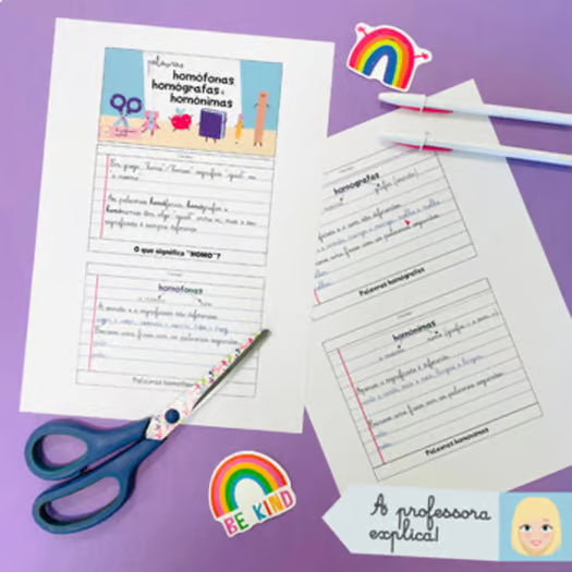 Flipbook com explicação e exercícios sobre palavras homófonas, homógrafas e homónimas.